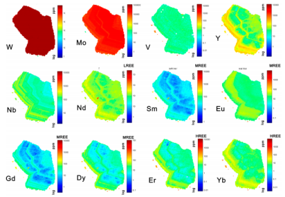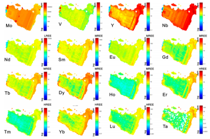 (3)Sch3是热液成矿主阶段的产物,存在于石英-白钨矿±辉钼矿±黄铁矿细脉中,在紫外光照射下展现出特有的黄色-蓝色荧光特性(图6-8)。Sch3可细分为三个亚型:Sch3a、Sch3b和Sch3c,它们各自呈现出不同的稀土元素分布模式(图6-7)。Sch3a的稀土元素分布图显示出相对平坦的特征,几乎没有或略带Eu正异常(图6I, 7P)。相比之下,Sch3b和Sch3c则分别以显著的Eu负异常和Eu正异常为特点(图7)。原位LA-ICP-MS mapping技术揭示了Mo、V、Y、Nb等元素在Sch3a、Sch3b和Sch3c中的分布存在差异性(图8)。