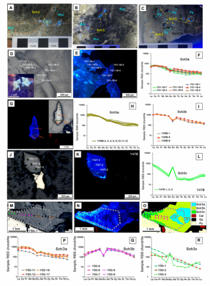 研究团队对阳储岭多产状白钨矿进行了系统的岩相学观察,并结合阴极发光(CL)、电子探针(EPMA)、原位LA-ICP-MS微量元素分析及Mapping技术,确定了三个世代的白钨矿(Sch1、Sch2和Sch3)各自特征如下: