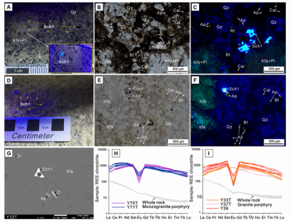 (1)Sch1以浸染状赋存于二长花岗斑岩和花岗斑岩中,颗粒形态多为次圆至他形,在紫外光照射下呈现均匀的蓝色荧光。Sch1主要与斜长石、钾长石、磷灰石、金红石等矿物共生(图2)。Sch1富含稀土元素,其∑REE+Y值介于1471 ppm至4059 ppm之间,表现出轻稀土元素(LREE)富集的特性,并伴有显著的Eu负异常(图2H-I)。Sch1的沉淀过程与早期岩浆热液有关,继承了阳储岭岩浆岩中LREE富集、HREE亏损以及Eu负异常的特征。