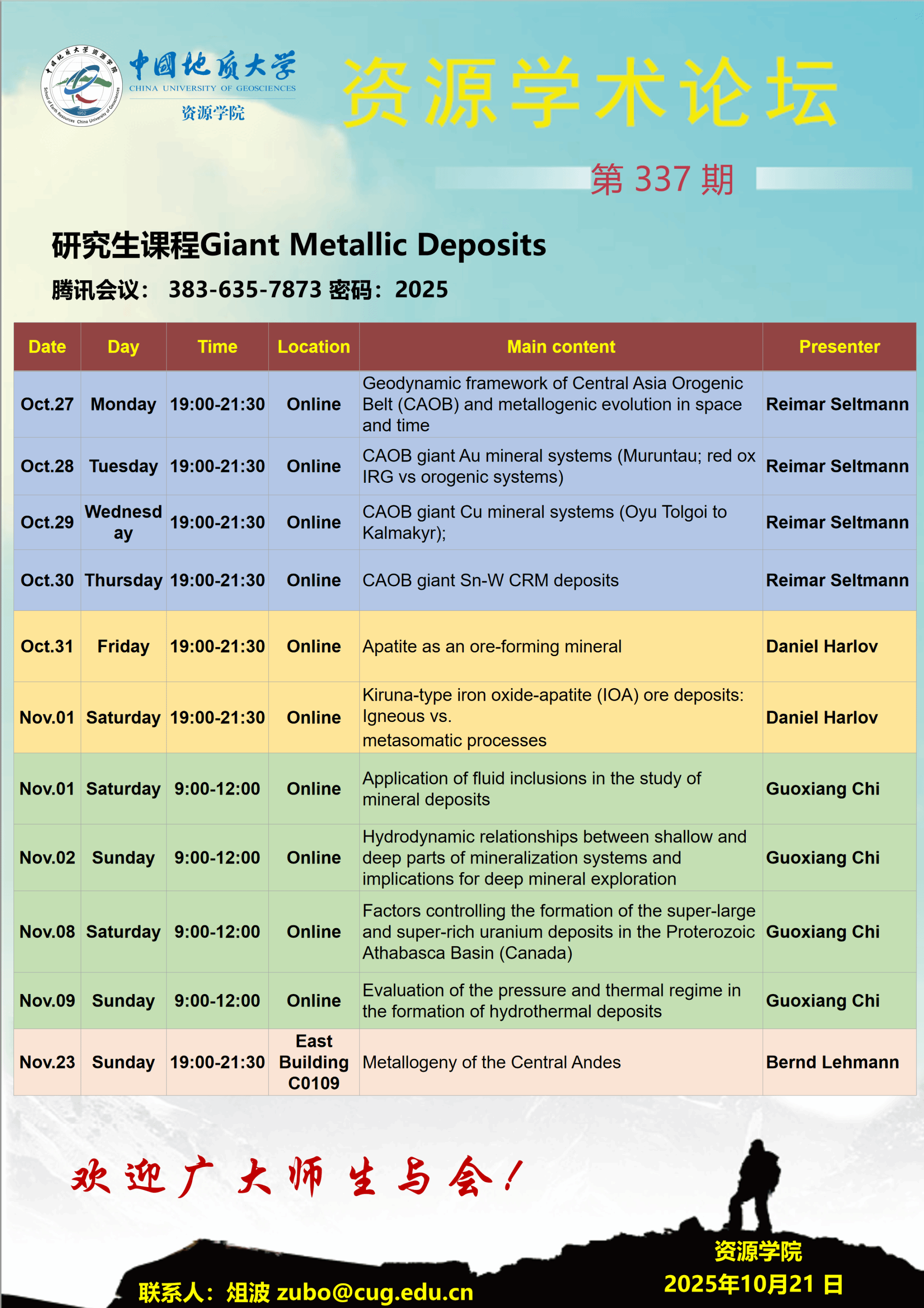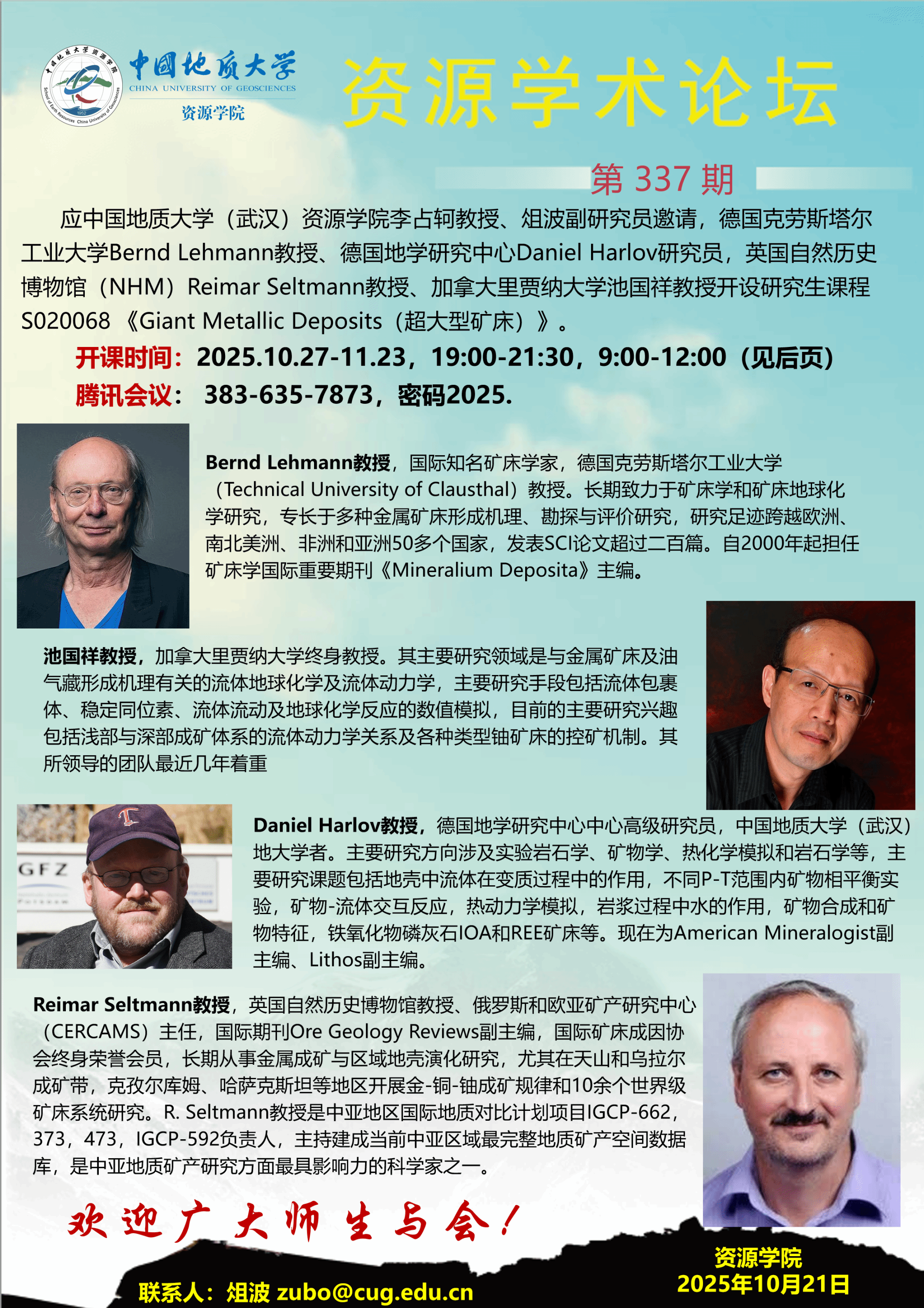 【10月27日-11月23日】第337期资源学术论坛:Giant Metallic Deposits(超大型矿床)