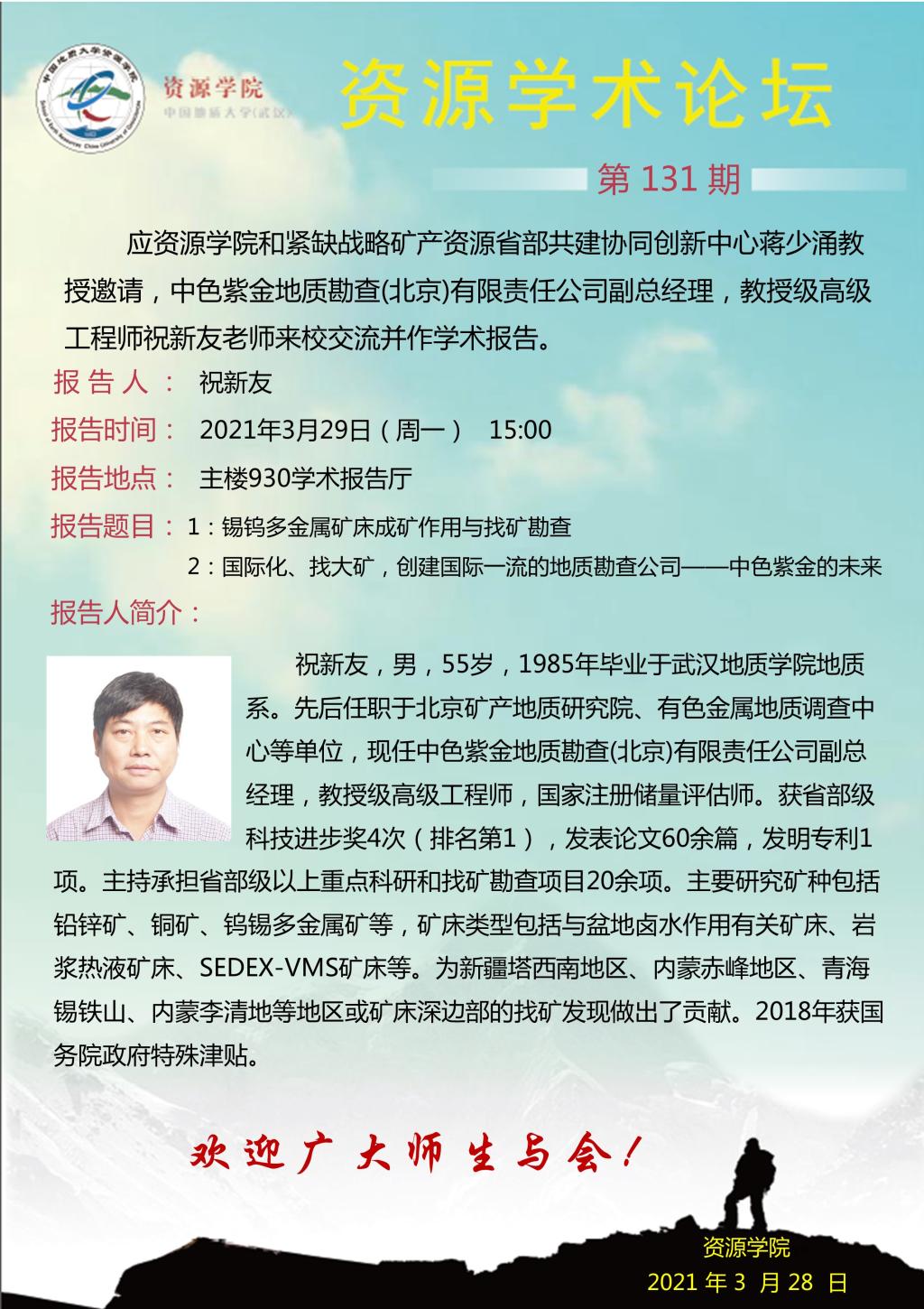 【03月29日】第131期资源学术论坛:祝新友学术报告