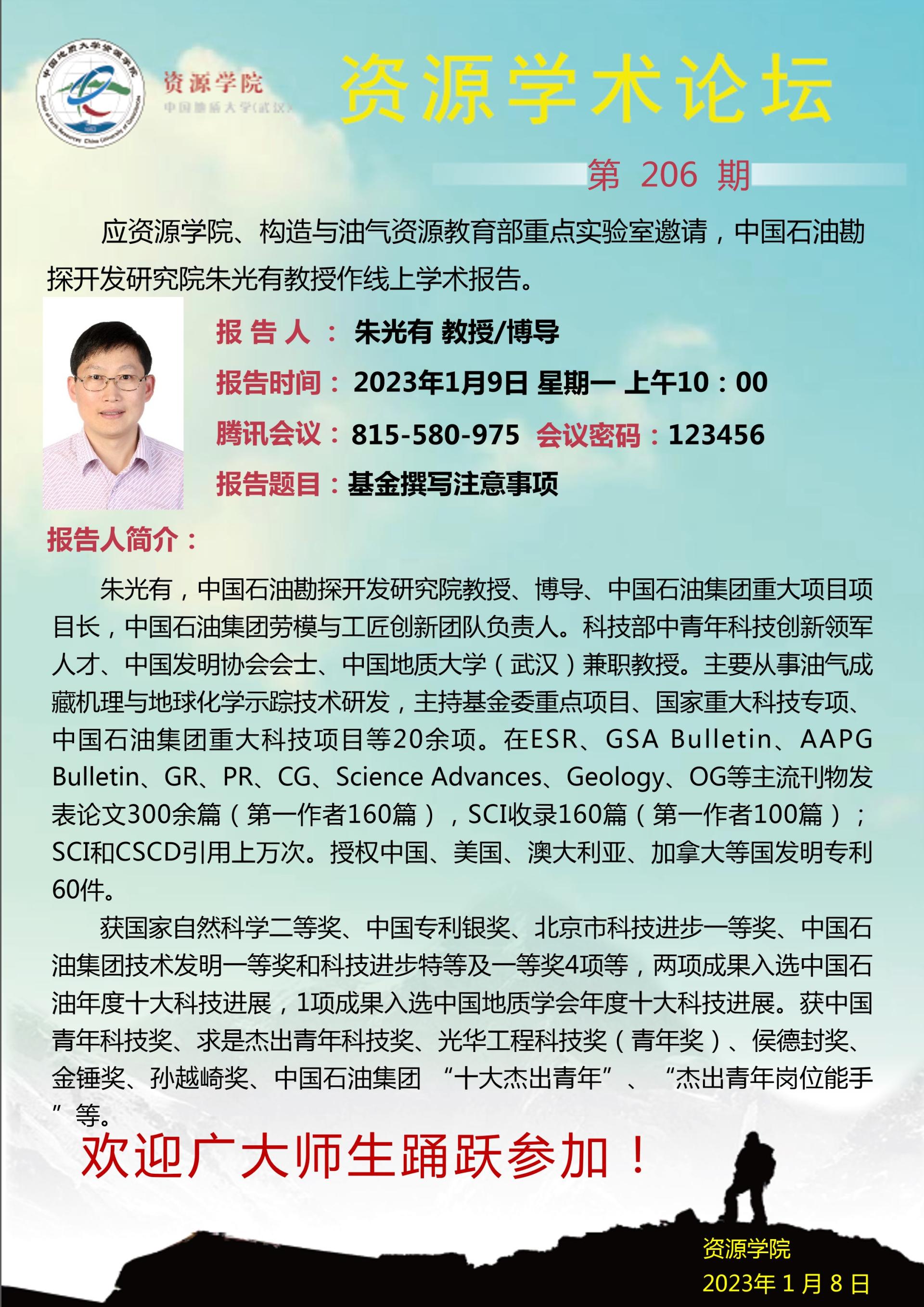 【1月9日】第206期资源学术论坛:朱光有学术报告