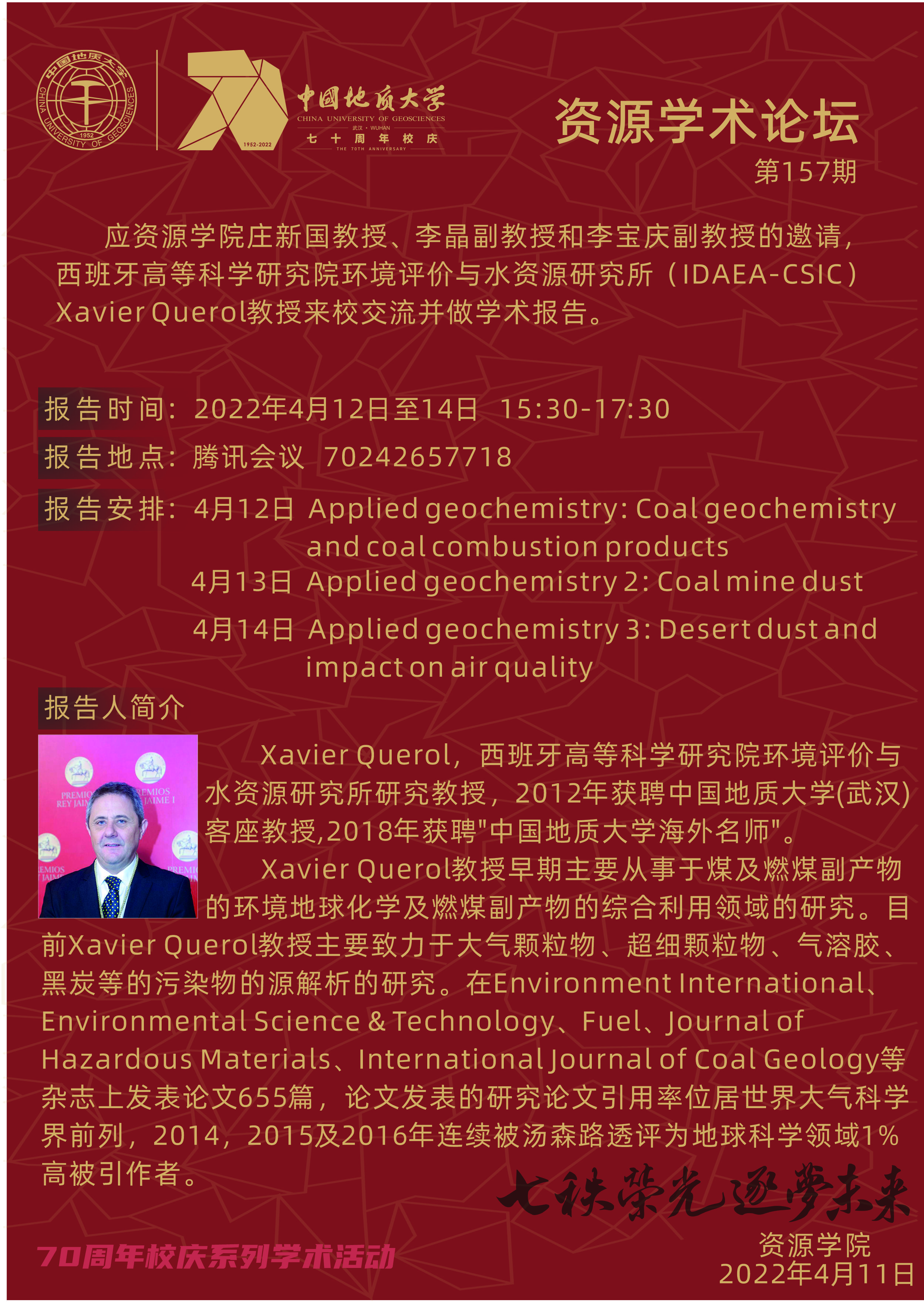 【4月12日-4月14日】第157期资源学术论坛:Xavier Querol 学术报告
