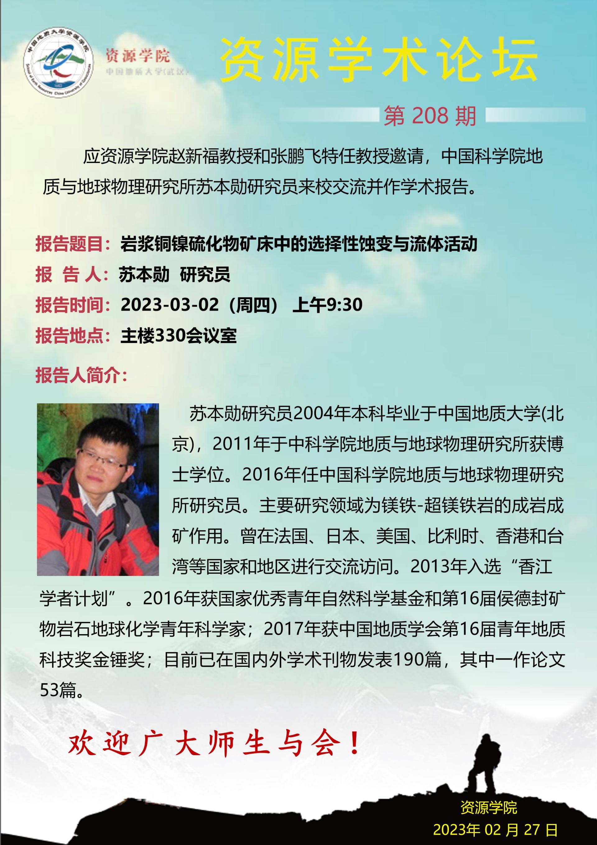 【3月2日】第208期资源学术论坛:苏本勋学术报告
