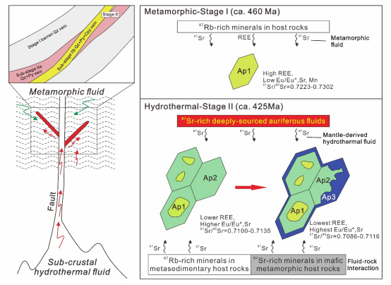 本研究表明,磷灰石是造山型金矿床成矿体系中变质-热液演化的有效“矿物探针”,其精细结构-年代学-元素-同位素特征可以有效约束造山型金矿床成矿体系的成矿时代和变质-热液成矿过程。该研究成果发表在地质学国际知名期刊《Geological Society of America Bulletin》上,论文第一作者为性吧