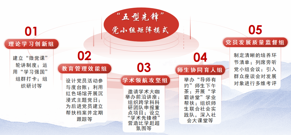 党支部由全国黄大年式教师团队-矿产勘查教师团队教师所指导的研究生组成。支部由国家杰出青年科学基金获得者、国家自然科学基金委创新群体负责人李建威担任责任教授,国家级青年人才吴亚飞担任党建指导员,通过“师生协同”“互融共促”,打造“党日课堂+导学课堂+帐篷课堂+一线课堂”四维课堂,以“五型先锋”党小组矩阵和“三级联动”机制激发活力,发挥了“两个作用”,做到了“七个有力”。