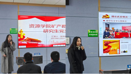 谭文伦总结讲话。他表示,近一年来,学院系统性加强学生党建工作,各学生党支部开展了系列探索,取得了一定成效,但还存在差距。他讲到,各学生党支部要按照学院党建“双创”工作部署,对照“七个有力”持续加强样板支部培育创建,一是加强理论学习组织,在学习体系、学习形式、学习成效检验等方面再深化、再创新,成为学习领会习近平新时代中国特色社会主义思想的桥头堡;二是持续深化师生结对共建,巩固“党-团-班、师-研-本”工作格局,以党的建设促进导学团队和班级建设;三是持续深化“党员责任区”设岗创建,加强党员教育管理,增强党员身份意识,加强党性修养,真正做到“一名党员一面旗帜”;四是持续强化品牌意识,紧密结合学科特点和专业优势,坚持引进来和走出去,建设具有资源特色的样板支部,成为服务同学成长成才、服务国家资源能源事业坚实堡垒,汇聚找矿报国、能源强国的强大力量。
