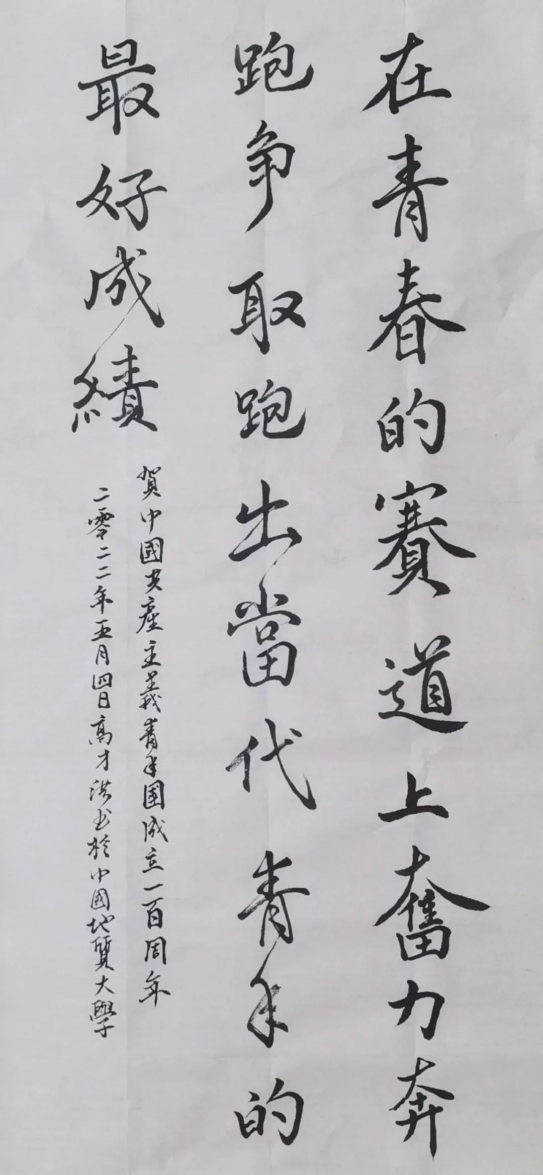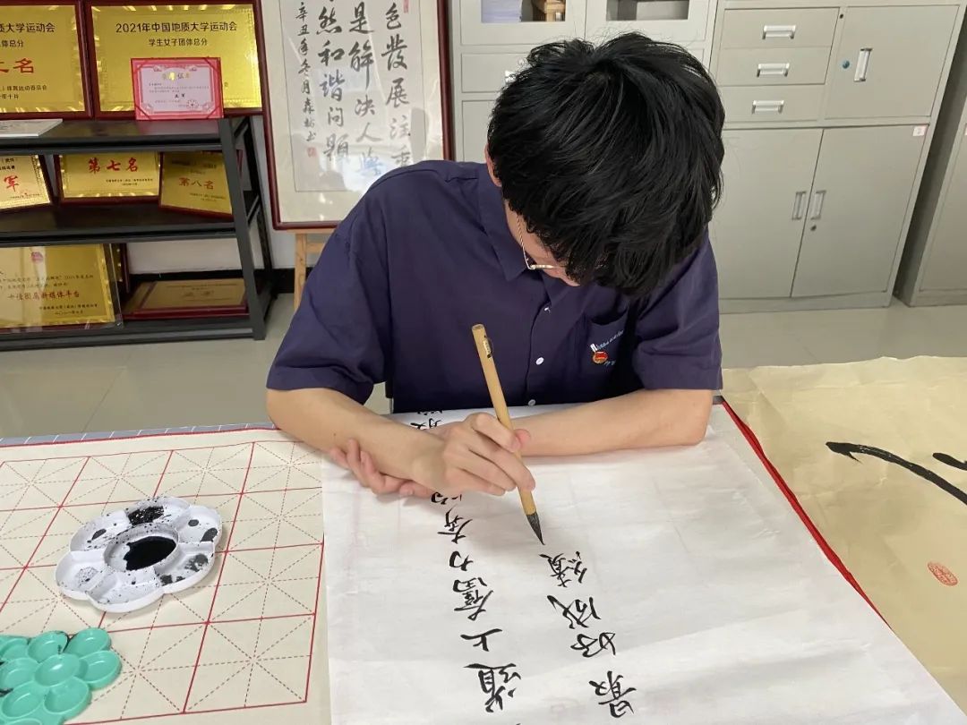 正值五四青年节之际,泼墨挥毫,挥翰临池,书写对祖国和团的美好祝愿,对未来的期盼。每个人都写出了属于青年人独有的豪迈与冲劲。“在青春的赛道上奋力奔跑,争取跑出你们这一代人的最好成绩!”习总书记在中国人民大学考察时说到。作为一名资源er,我们也应在青春的赛道上奋力奔跑,努力学好专业知识,为国家资源能源事业贡献自己的一份力量。