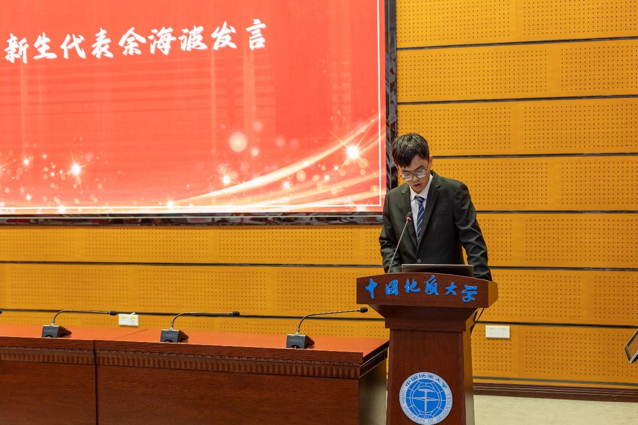 新生代表余海波同学发言。他倡议同学们要继承老一辈地大人、资源人的昂扬斗志,践行“艰苦朴素 求真务实”校训精神,把握好最美青春年华,用不懈努力在性吧