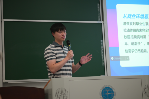 刘睿作《就业形势》专题报告。他介绍了当前高校就业总体情况、地矿行业就业形势和学院近些年就业情况。他讲到,国家迫切需要资源能源领域优秀人才,同学们要把握形势、选好赛道、随时准备,在实现职业发展目标中与伟大时代的“双向奔赴”。