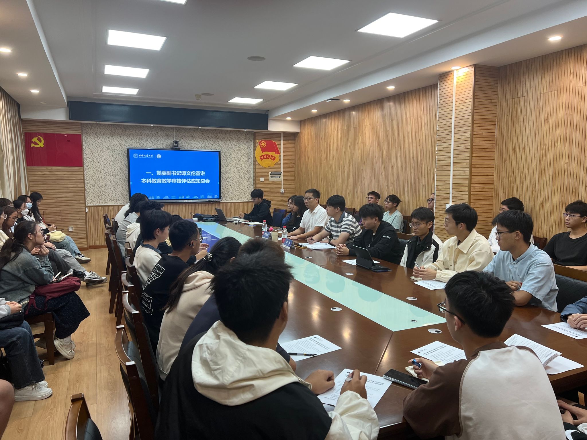 在南望山校区西区文华楼201召开本科教育教学审核评估专题工作会(团学骨干专场)暨新学期团学重点工作研讨会。学院党委副书记谭文伦、团委副书记(主持工作)刘睿,2024届团学组织主席团成员,团委直属部门、学生会、研究生会、红星青年志愿者协会、融媒体中心负责人及部门团学骨干参与会议。