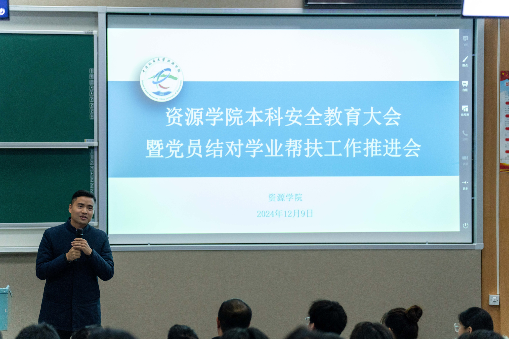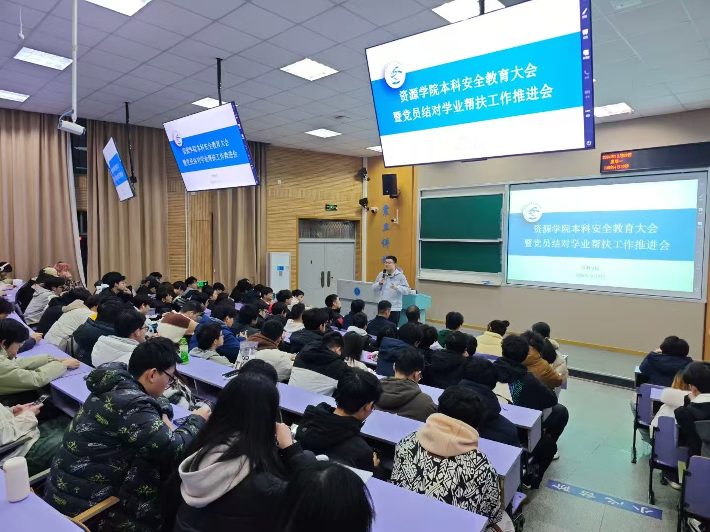 举行本科生安全教育大会暨党员结对学业帮扶工作推进会。安全保卫部治安科彭红进、法律援助办主任魏景明、学院副院长李占轲、班主任代表滕长宇、辅导员彭鑫、兼职辅导员管晨璐,2023级、2022级结对帮扶全体学生以及各班级学生骨干参加会议。