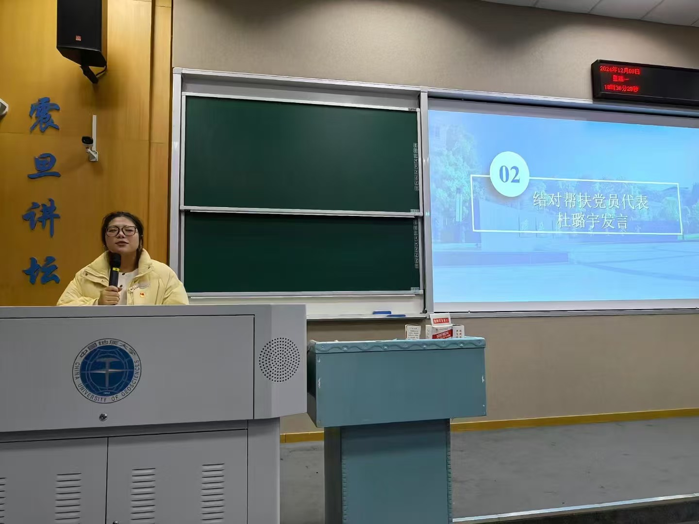 学生党员帮扶代表杜璐宇发言。她结合自身学习经历分享了学习经验和帮扶计划,呼吁帮扶党员要与学业困难同学加强联系,帮助结对同学赶上学业进度。