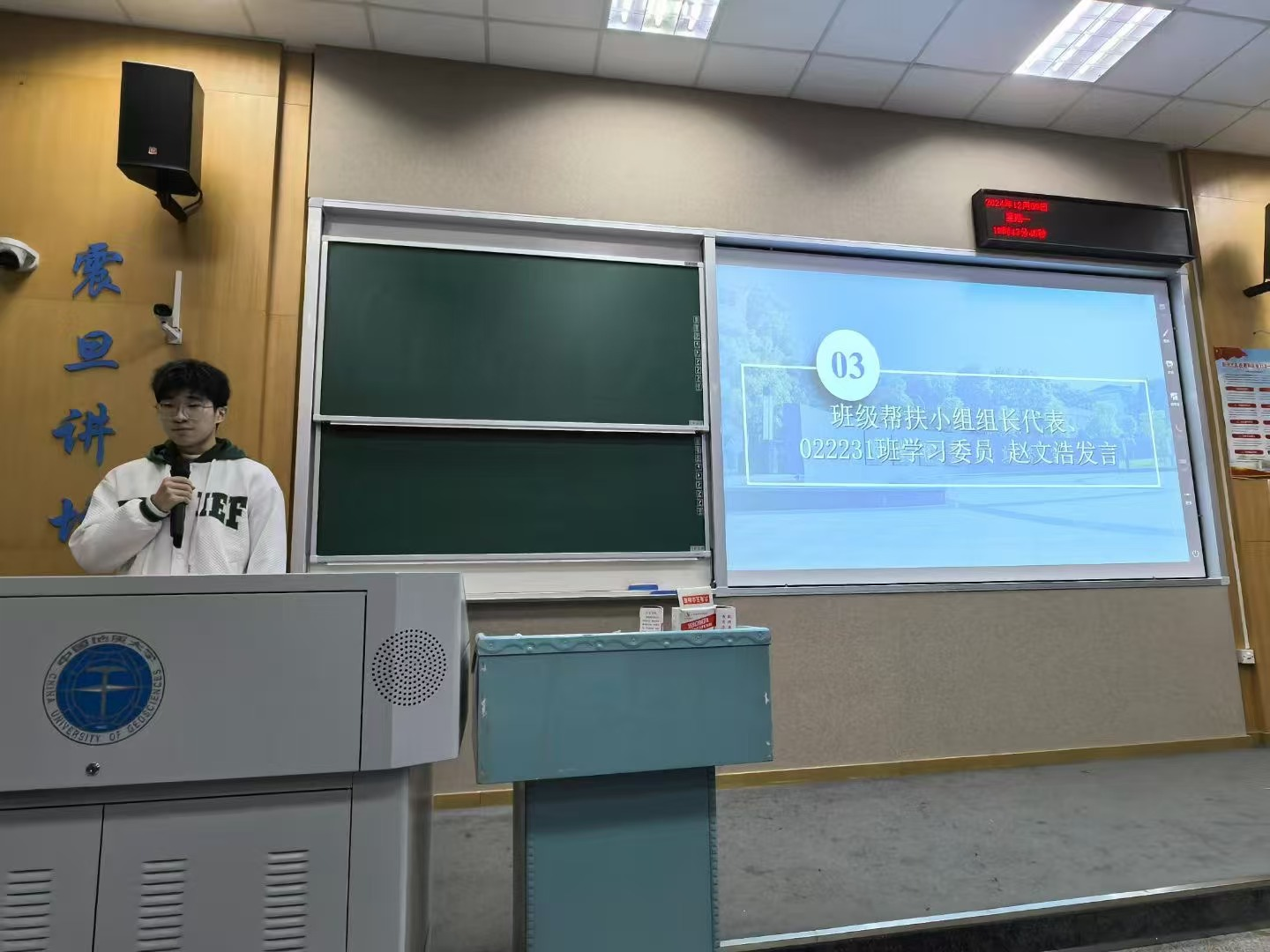班级帮扶小组组长代表、022231班学习委员赵文浩发言。他分享了班级学风建设的具体举措,介绍了学期末班级开展学业帮扶的冲刺计划。