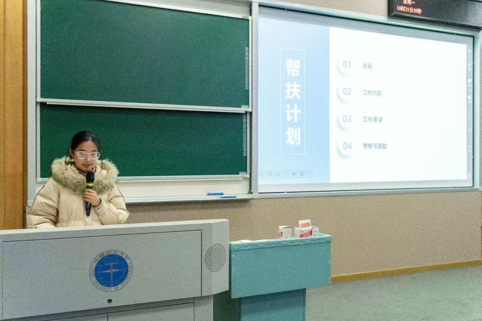 学生会学习部董昱含解读结对帮扶方案。她从工作内容、工作要求、考核与激励三个方面介绍帮扶措施。