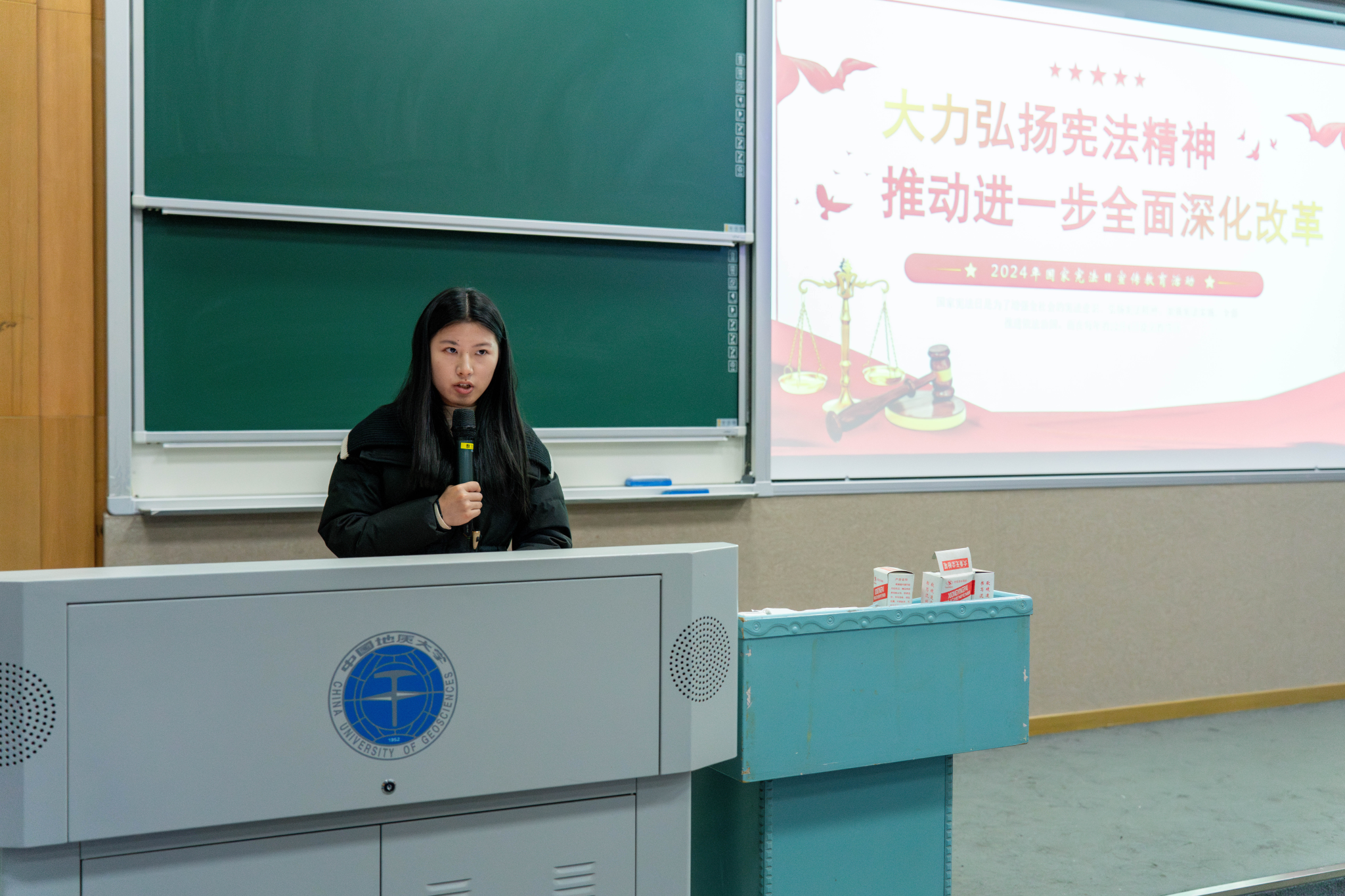 管晨璐作宪法学习宣传。她介绍了宪法卫士网络学习等活动,呼吁同学们以宪法宣传周为契机,积极参与宪法学习,做宪法的自觉遵守者和坚定捍卫者。