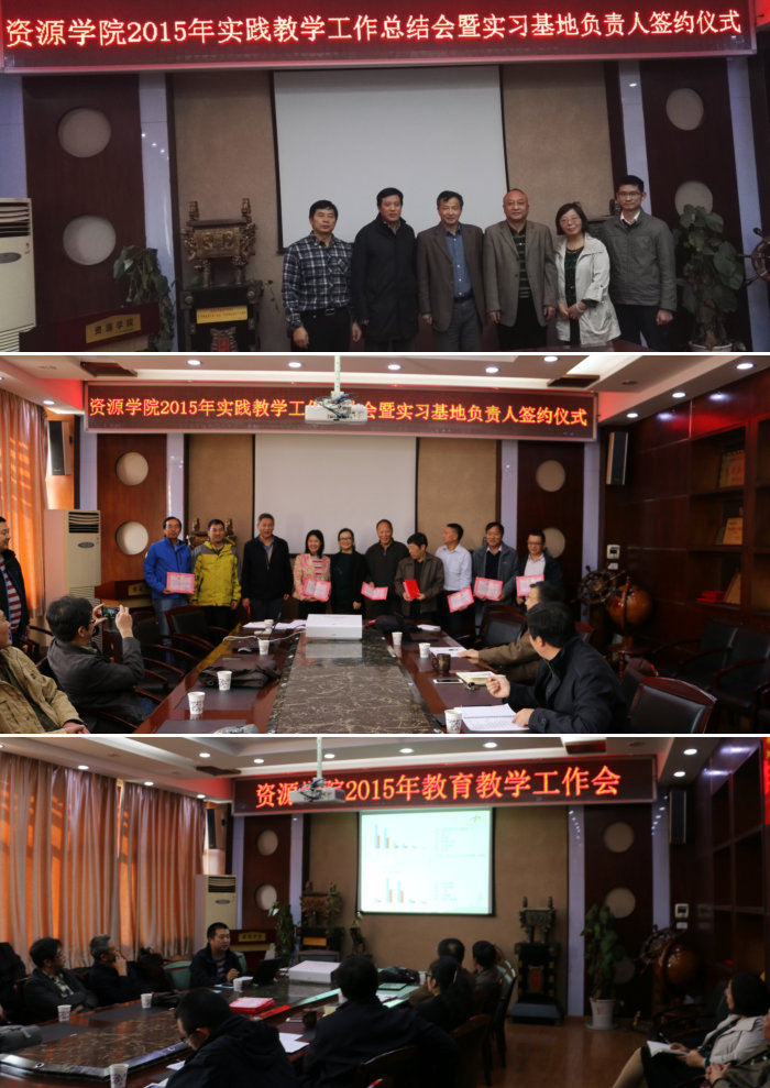 在主楼328召开2015年实践教学工作总结和教风学分研讨会。院长解习农、党委书记郭秀蓉、副院长石万忠、副院长姚光庆、副院长魏俊浩、副书记张建华、学院新聘任16位教学督导员(均为教授)、新聘任的三个专业实习基地的队长和副队长、2015年三大实习基地(周口店、北戴河、秭归)和江汉油矿实习队长、学院教学委员会成员、各系教学主任及教学秘书参加了会议,副院长石万忠主持会议。