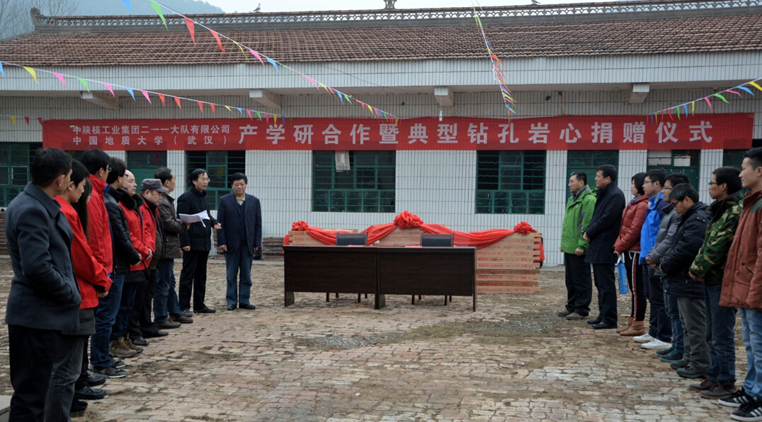 在双龙铀矿找矿突破中所起到的重要科研支撑作用和对二一一大队一线工程技术人员的培养,他衷心祝愿中地大与二一一大队共建而相助,合作而共赢,发展而互撑,协同而共谋。兰廷泽处长代表学校签署了捐赠协议,并高度赞扬了二一一大队对学校教学实践、科研工作和学科建设等方面的大力支持。双方约定,将进一步加强合作,通过教学研究,像“考古”那样让“石头”会说话,让珍贵的岩芯标本发挥重要的教学实践功能。
