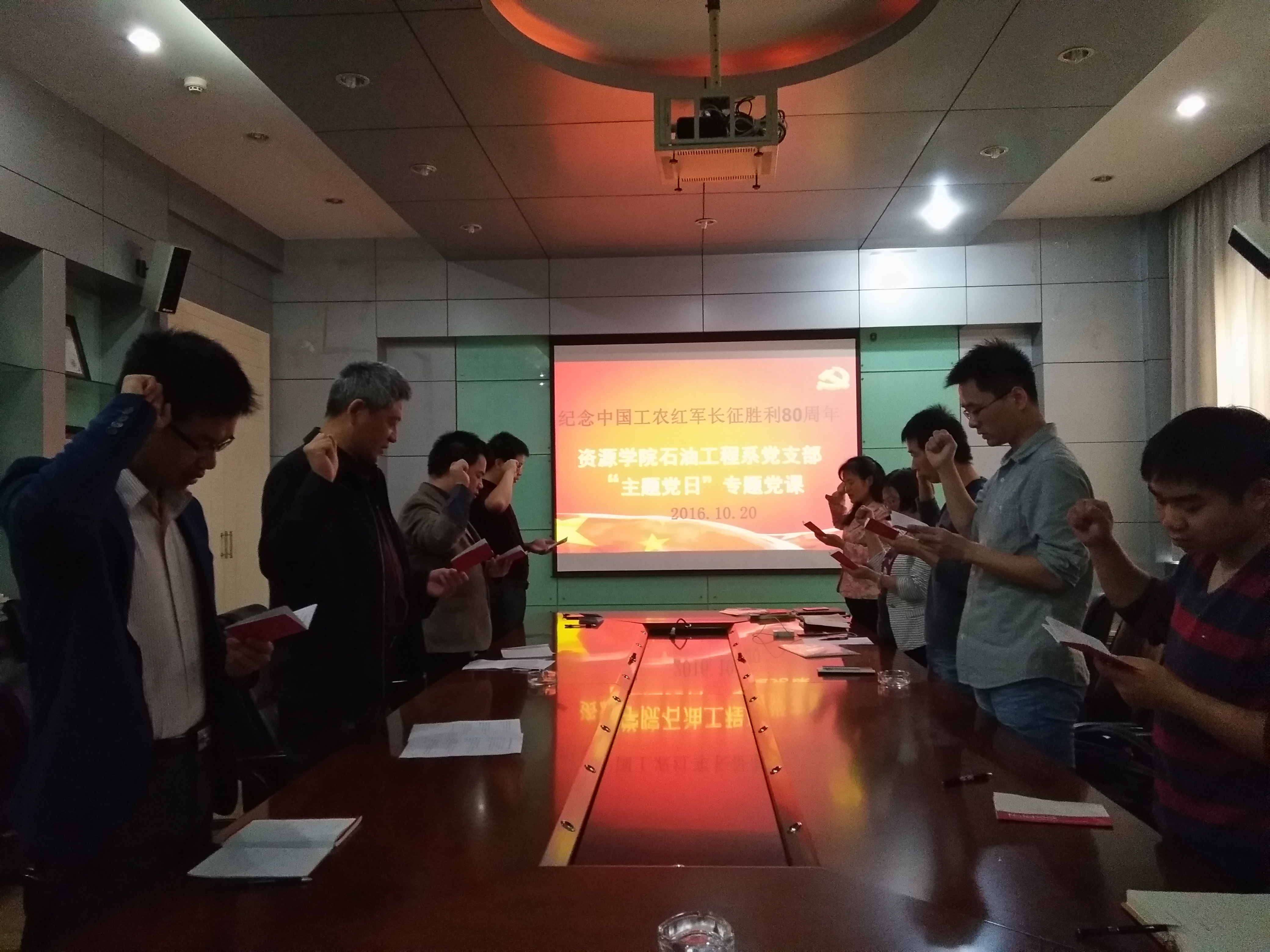 主题党日活动在齐唱国歌、重温入党誓词中拉开序幕,支部书记谢丛姣同志带领大家学习了党章中的部分章节,组织委员杨宝林同志收取了10月份的党费;随后谢丛姣同志介绍了中国工农红军万里长征的历史、意义以及长征体现的精神,并从如何做新时代长征人和始终保持共产党人的政治本色等方面进行了阐述。最后支部每位党员纷纷就自我对红军长征的精神理解以及在主体责任、作风建设和服务师生等方面存在的问题进行了热烈地讨论。老教师们认为乐于吃苦、不惧艰难的革命乐观精神是战胜一切困难的重要法宝,在当前石油行业整体低迷的特殊时期,更需要进一步坚定信念、稳扎稳打、夯实内功,强化党员在学科建设中的带头作用,强化老师对学生在就业指导、专业咨询等方面的服务意识。年轻老师们纷纷表态,通过深入了解了长征的背景与伟大历史意义,进一步树立了对党的坚强领导的坚定信念,在平凡的工作岗位上恪尽职守,埋头苦干,积极奉献。