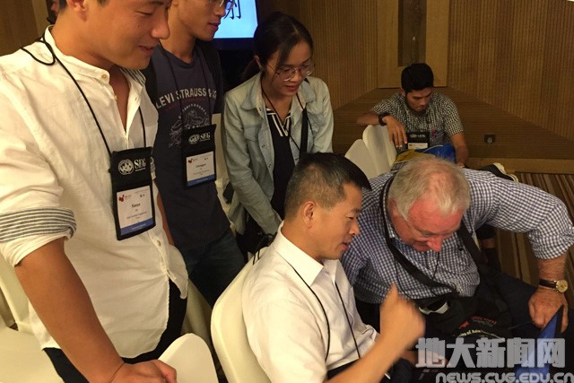 李建威和学生在国际矿床学家协会年会现场与国际同行进行交流