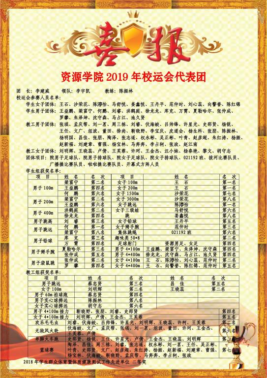 在三天的激烈竞争中,资源健儿们秉承着“更高、更快、更强”的体育精神在赛场上奋力拼搏,不断超越,最终取得了总成绩学生组男子团体第一名,女子团体第四名,教工组男子团体第六名,女子团体第六名的优异成绩,传承了我院群众体育工作的优良传统!