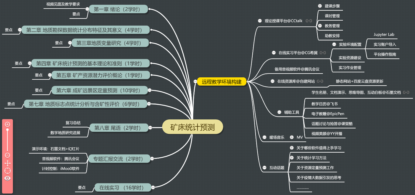 在讲课过程中,老师需要临场发挥但幻灯片内容和当前话题无关,可以利用电子教鞭工具直接将屏幕变成白板边讲边画、或者打开引擎搜索/百科/知乎搜索对应话题打开网页。让远端的学生感受到可视化的思维过程,变授人以鱼为授人以渔。进一步地,我也在构想某些教学环节中能否摆脱对PPT的依赖,借助云计算辅助教学(ComputerAssistedInstructions,简称CAI))工具的优势,变知识单向输出为主的教师Talk为师生协同汇聚知识的Dialogue,变固化的PPT为灵机一动的PowerPoint画面呈现,变授人以渔为授人以欲来激发学生学习兴趣和求知欲。例如面向基地班教学过程中,可以充分利用卓越班已经发布的各类教学资源、网上开放的学习资源开展一定程度地自主学习(调研中不少学生也表示没有充足的时间在课堂外进行自学),在阶段小结或期末复习课堂内的有限时间的教学活动中,依托石墨文档(//shimo.im/)等云办公软件的思维导图、互动白板工具,按指定的讨论主题、讲课提纲及教材章节标题为引导,师生在云端紧张协同地进行头脑风暴,共同编辑指定的思维导图文档或白板文档,让学生充分参与到教学活动中来,对教学要点内容进行师生共同的梳理和总结,各抒己见贡献自己的知识,同步呈现讨论思路及其结果。师生教学活动既然已经都全程在线了,不妨利用信息技术将教学活动的版图设计得更大些,让知识的力量“穿透”屏幕画面双向地“流”起来、“动”起来,见字如面,定格时光。