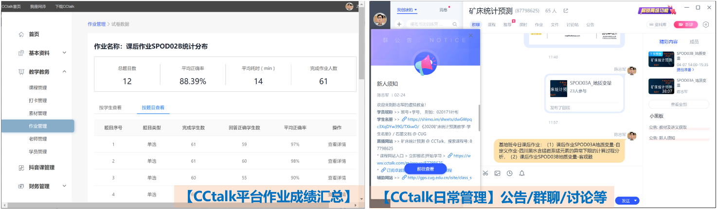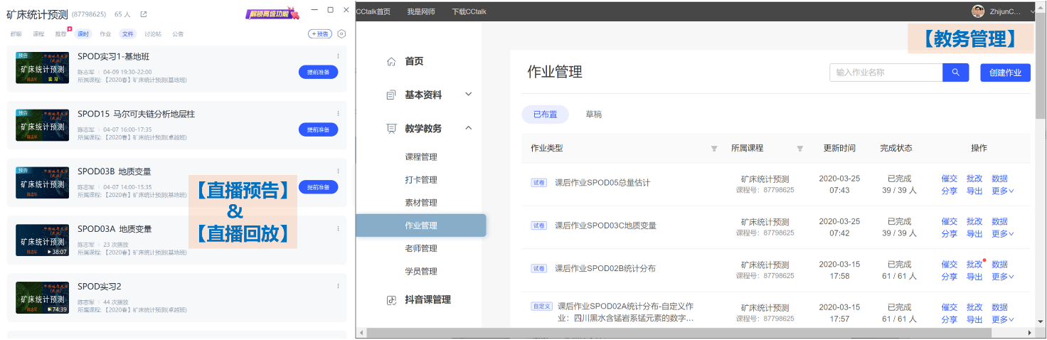图1:CCtalk平台的理论授课、作业/实习讲解,直播回放,学习管理系统支持