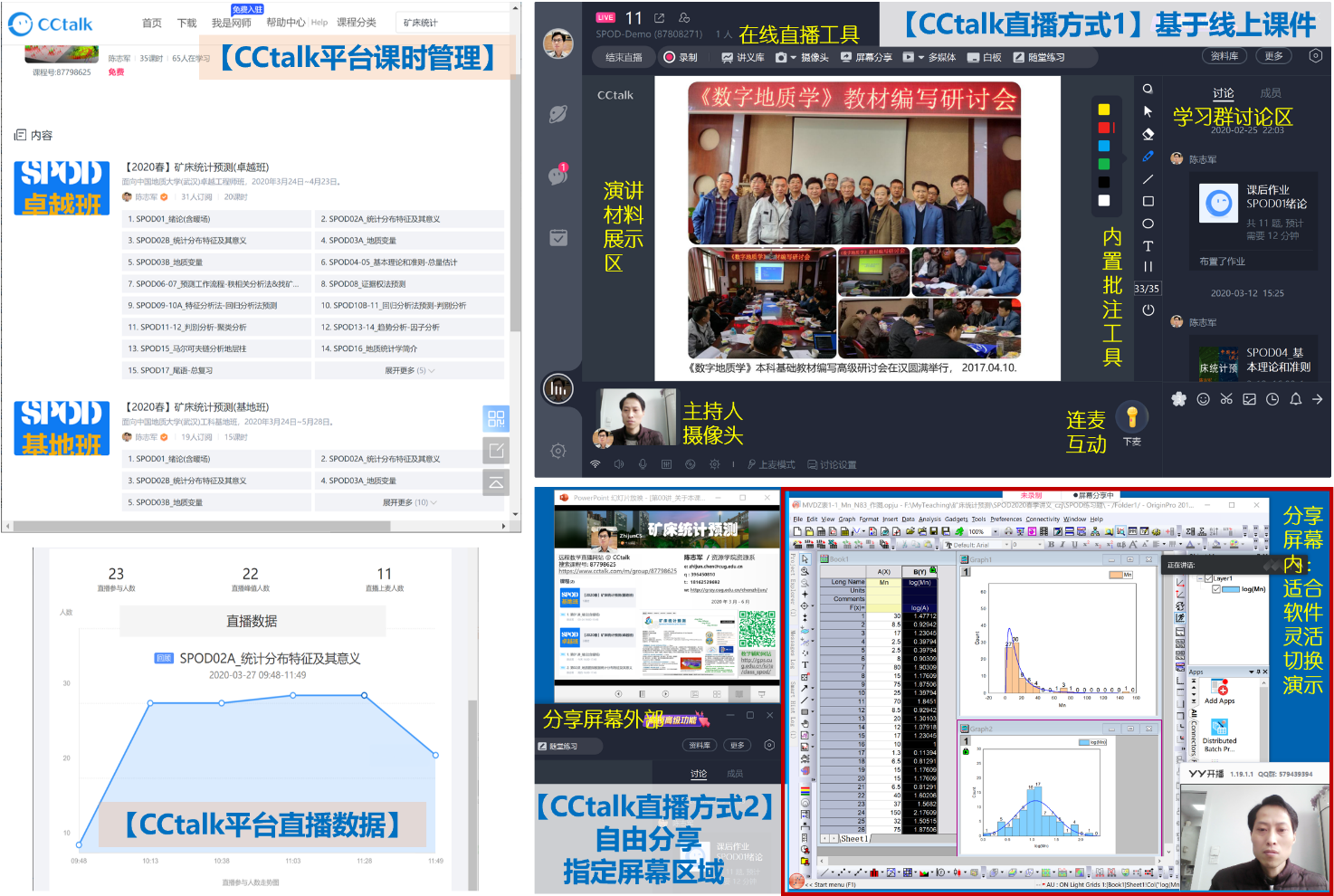 经过一个半月左右的教学实践,基于“CCtalk+CG希冀”两大平台来协同开展《矿床统计预测》远程教学有信心能有效完成理论与实践全环节的教学过程,基于上述平台学习的学习活动,能够对学生的成绩评定给与公平公正的评价。本学期成绩评定本人采取的方式是:平时成绩 30% + 实习成绩 20% + 课程报告50%,平时成绩来自CCtalk教务管理数据(课后作业、课堂内外互动、在线测试)、实习成绩和课程报告来自CG平台在线实验和作业数据。
