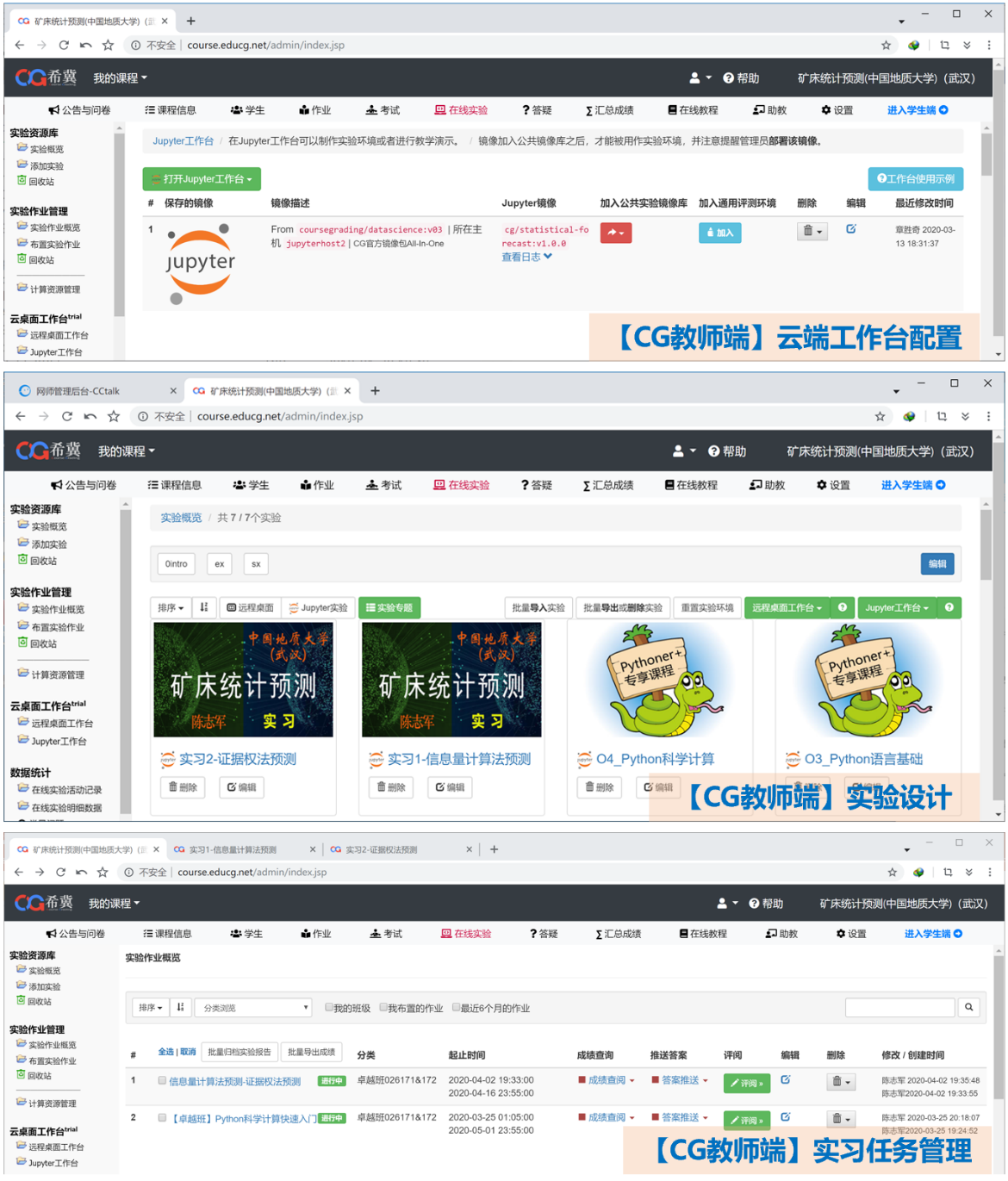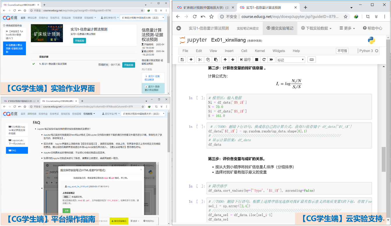 在《矿床统计预测》实习环节,顺应地学大数据发展趋势,本人采用Python技术更新了原有的实验材料。有近十位学生反馈他们的电脑不能成功安装Anacoanda科学计算环境,为此,认真调研云端实习的解决方法,最终选择北航希冀(CG)在线实验平台来完成教学实习环节。CG平台是一个国内既专业又有温度的计算机类课程一体化支撑平台,定位于全面支撑计算机、人工智能和大数据专业建设的大型综合教学实验平台,全面支持Jupyter Notebook科学计算环境的在线运行。本人将实验资源上传到平台上后,可以灵活调取创建在线实验作业并设定任务时间,并且支持一次作业任务中能安排多个小型实验,可以完美解决一次实习课中需要完成多个实验,两个教学班实习异步问题可以各种独立发布实习任务即可,无需重复上传实验材料。学生账户可以由教师批量导入,并随时随地开展实验并撰写实验报告。学习大数据课还可真实显示各个学生在线实习时间情况。此外,CG平台还支持CBS推流,课程信息、在线作业、在线考试、在线答疑、在线教程开发等学习管理系统功能也是非常强劲的。