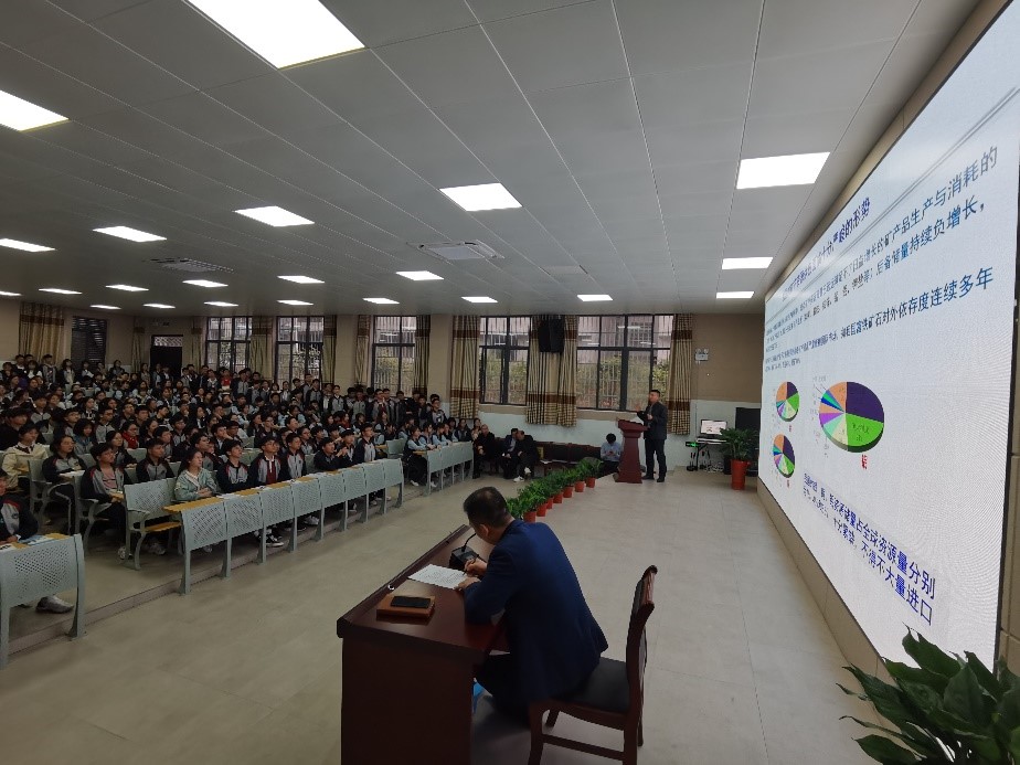 的总体情况。李艳军以“资源勘查工程介绍”为切入点,为同学们上了一堂生动的大学先修课——“稀土资源与大国博弈”。他向同学们介绍了“矿产资源分类”“我国矿产资源面临的形势”“关键金属矿产资源”,并指出矿产资源是经济社会发展的重要物质基础,新时代国家的资源能源事业需要综合性的资源人才,资源能源事业大有可为!他勉励同学们要在高中阶段打好基础,保持对科学的好奇心,成长为对国家和民族有用的青年学子。