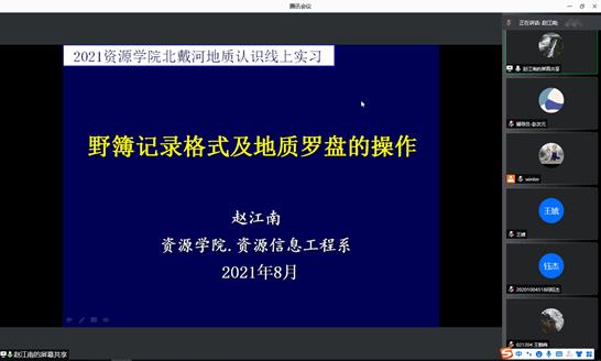 北戴河地质认识实习线上动员会正式开始。北戴河实践教学团队全体成员、辅导员以及全体参加实习的学生参加动员会。2020级辅导员彭友元主持会议。