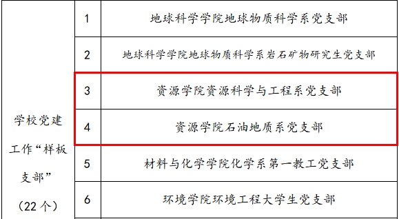 党委、石油工程专业本科生党支部以突出的创建成效顺利通过学校首批党建工作“标杆分党委(党总支部)”“样板支部”项目验收;同时,有5个项目获得第二批立项培育,其中资源科学与工程系教师党支部、石油地质系教师党支部入选学校党建工作“样板支部”、矿床学研究生党支部入选“研究生样板党支部”、张启扬和万晓帆入选“研究生党员标兵”的培育创建名单。