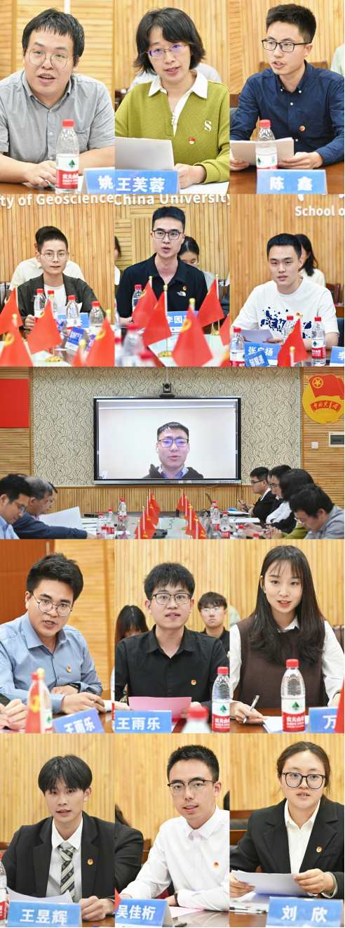 湖北省向上向善好青年姚卓森、2023年度十佳班主任王芙蓉、第十六届学校十大杰出青年陈鑫、2023年度学校十大标兵研究生林磊、2023年度学校十大标兵学生方豪、2023年度学校创业之星暨创业先锋(地灵科技武汉有限公司总经理)李园平、学校研究生党员标兵培育创建个人张启扬、2024届博士毕业生邹耀遥、2024届本科毕业生生王雨乐、构造-成藏年代学研究生党支部书记万晓帆、学校2023年度五四红旗团支部标兵020211团支部书记王昱辉、学生会主席团成员吴佳桁、红星志协主席团成员(学校十佳大学生志愿服务个人)刘欣等13名青年师生代表结合学习和工作经历,围绕主题畅谈实践体悟和价值追求。青年教师代表表示,作为高校教师要志存高远,脚踏实地,躬耕教坛,科教融汇,继续书写“师者传承、探矿创新、立德树人”的壮丽篇章。青年学生代表讲到,榜样在前,重任在肩,要热爱祖国、立志成才,扎根专业领域,提升综合素质,继续讲好资源能源报国故事。团学骨干代表谈到,要聚焦政治引领,践行服务宗旨,在为公与修己相统一中实现价值,引领资源青年以身许党、成才报国。