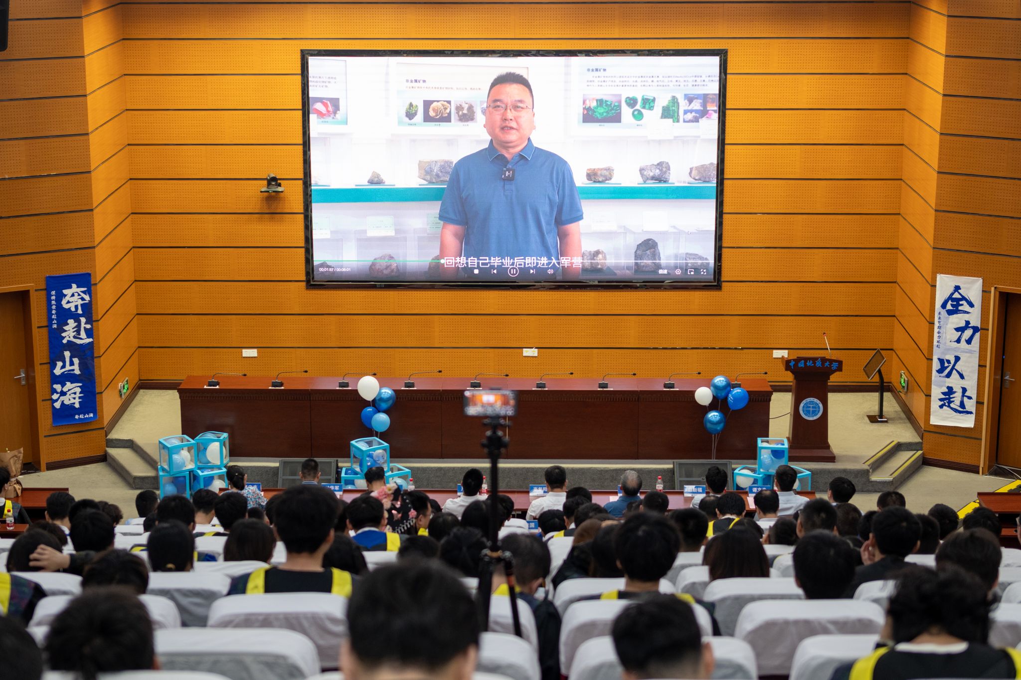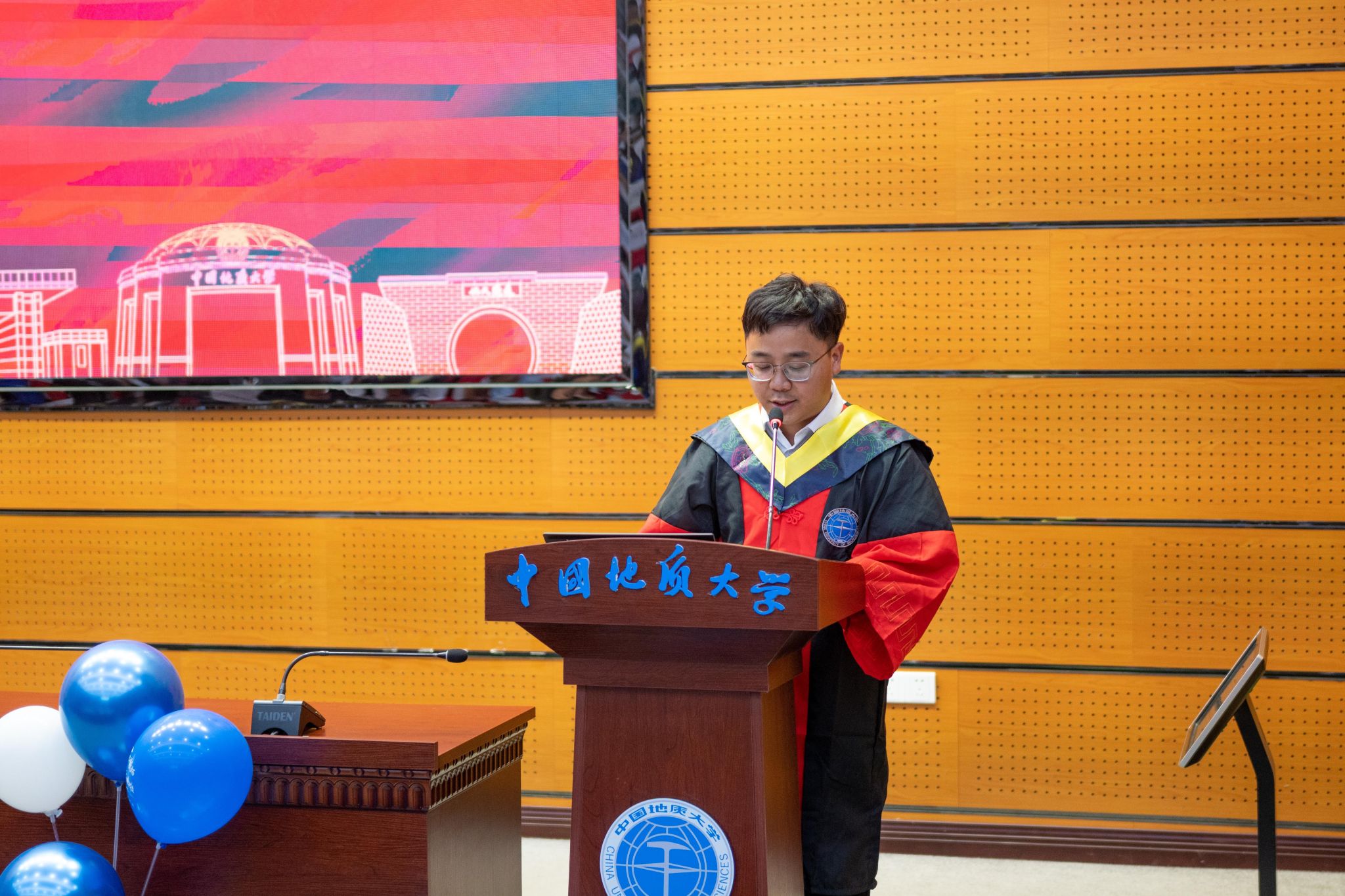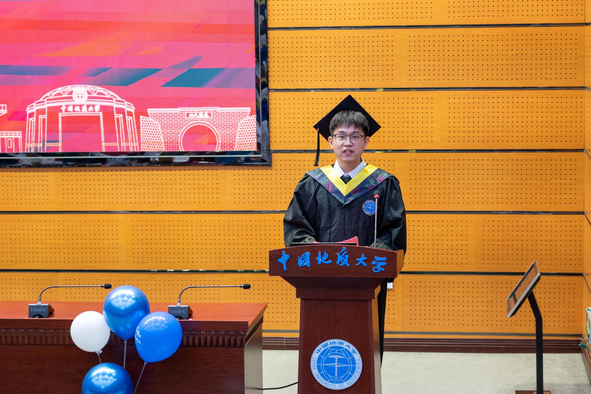 本科毕业生代表王雨乐发言。带着对师长、亲友的感恩,他感慨于四年的经历与成长,在大学中的所见所闻、所学所得、所思所感给予了他面对挑战的底气与砥砺前行的动力。即将入职紫金矿业集团、去到地质行业的第一线的他,励志为服务和保障国家能源资源安全贡献自己的绵薄之力。同时他祝愿同学作为新时代地大青年能够秉持坚守初心的执著和心怀家国的担当,在地质工作前辈的肩膀上顶起这一片赤红的天空,永远做肩上飞扬有风、心似滚烫火焰的有梦少年。