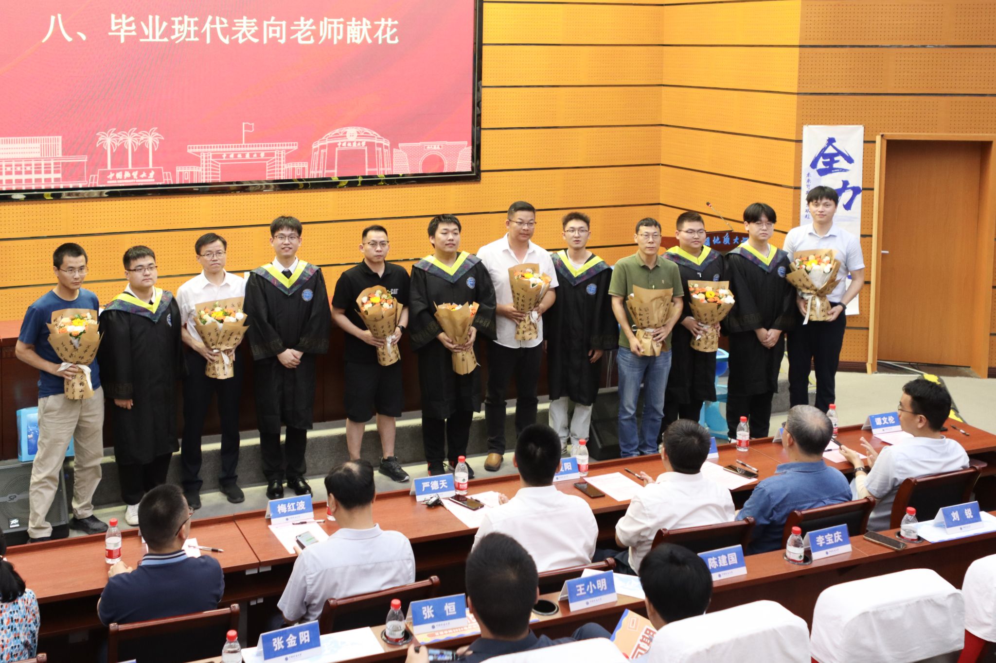 毕业班代表向班主任、辅导员、导师献花。感恩老师们一路的辛勤培育和悉心培养。