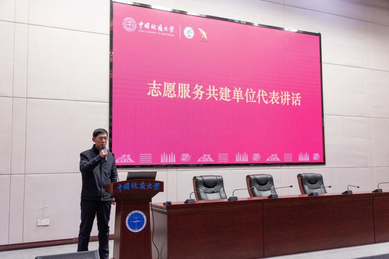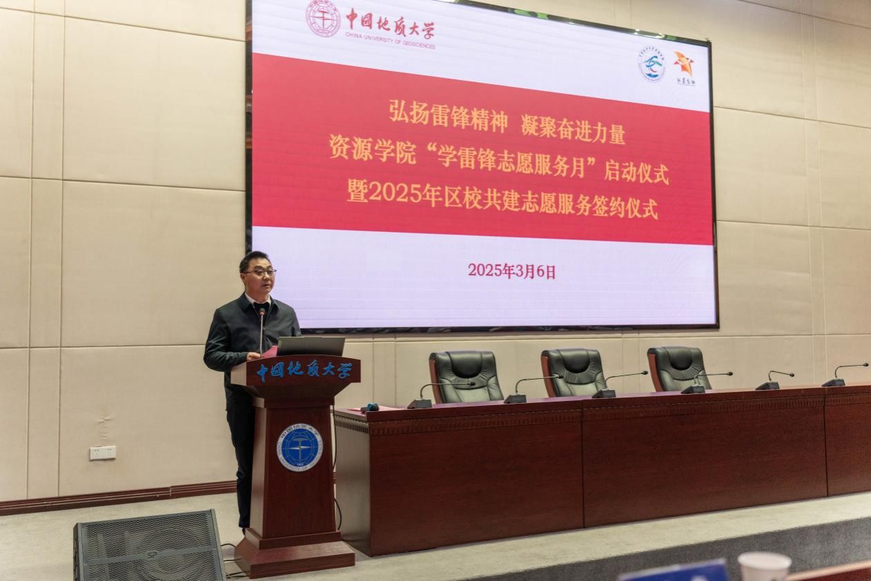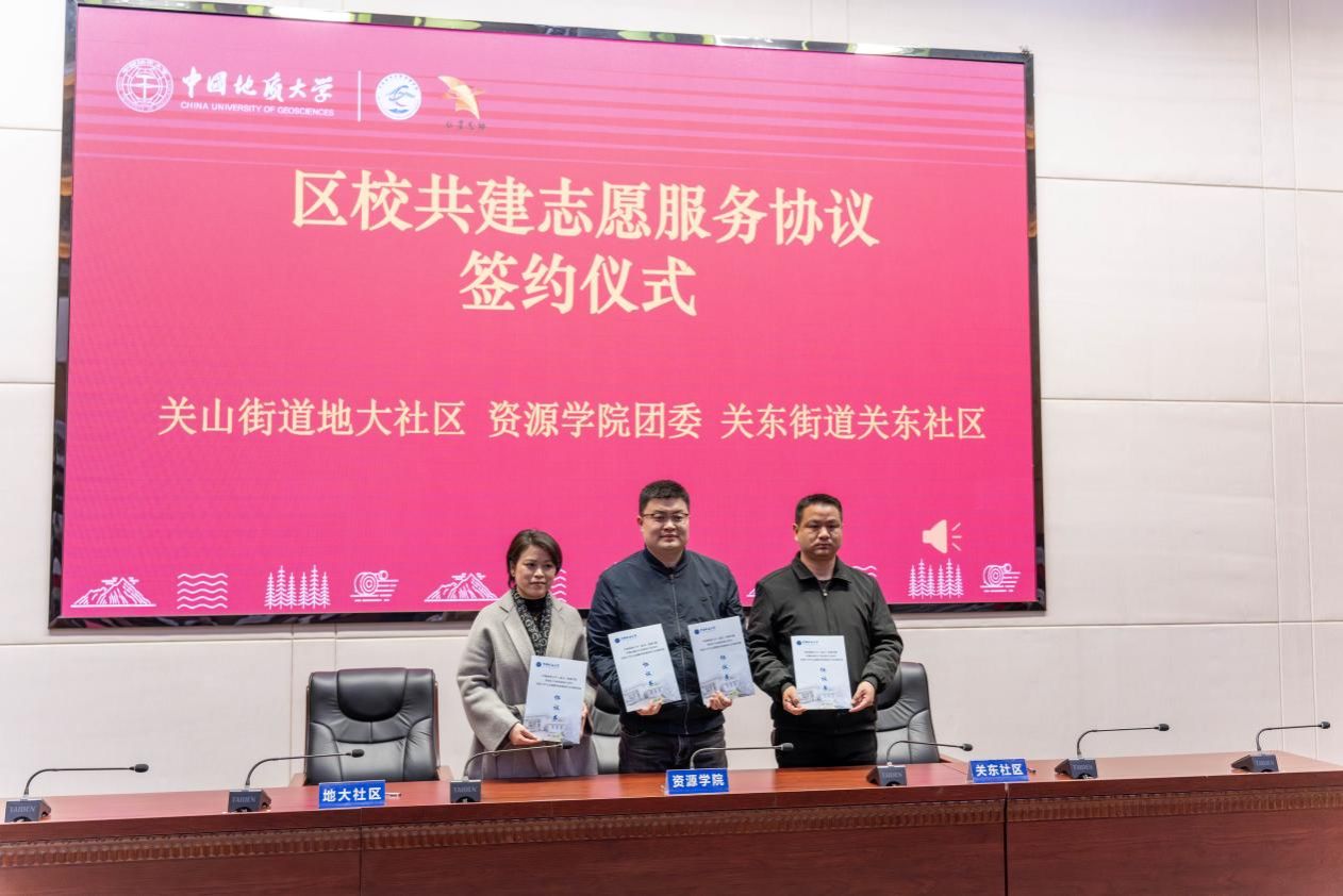 举行“学雷锋志愿服务月”启动仪式暨2025年区校共建志愿服务签约仪式。关山街道地大社区党总支书记吴红莉,关东街道关东社区党委书记李靖;学校离退休工作党委书记李门楼、处长张宽裕、副处长齐世学、活动管理科科长周火平;学校团委副书记郭小玉;性吧