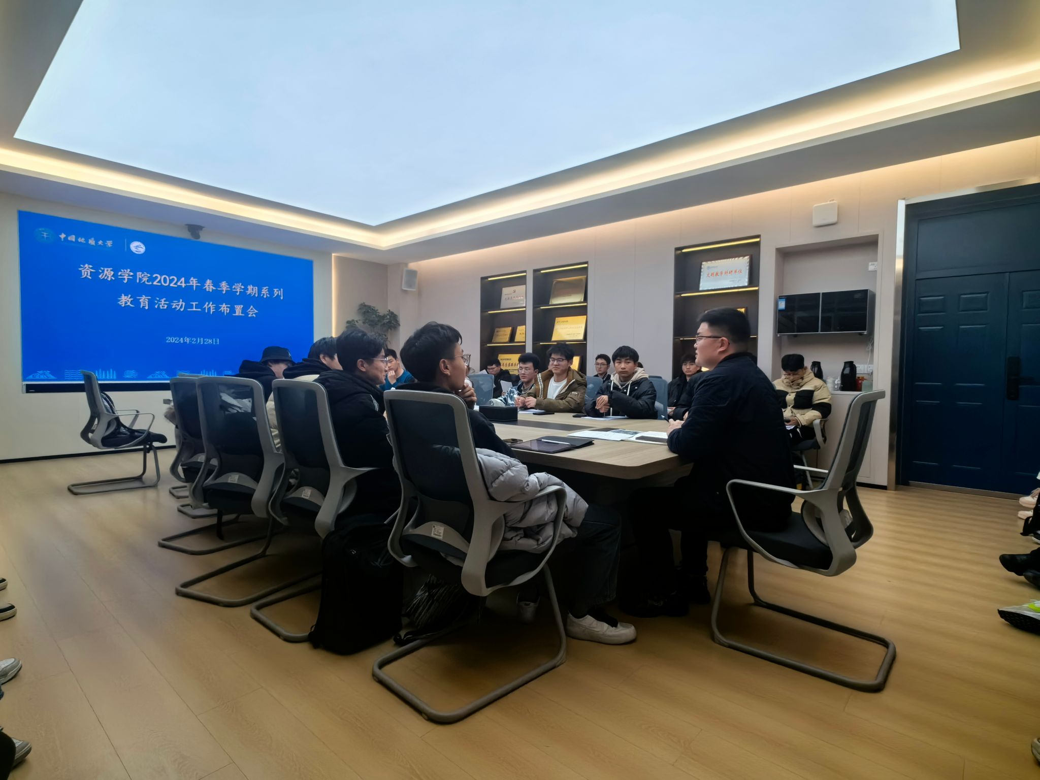 2024 年春季学期系列教育引导活动班级工作布置会在主楼330 举行,学院各班班长参加会议,辅导员彭鑫就春季学期班级学生返校思想动态调研、安全教育、心理健康等重点工作进行布置,并以“学习新思想,做好接班人 ”“技能成才,强国有我 ”为主题布置新学期首次主题班会。