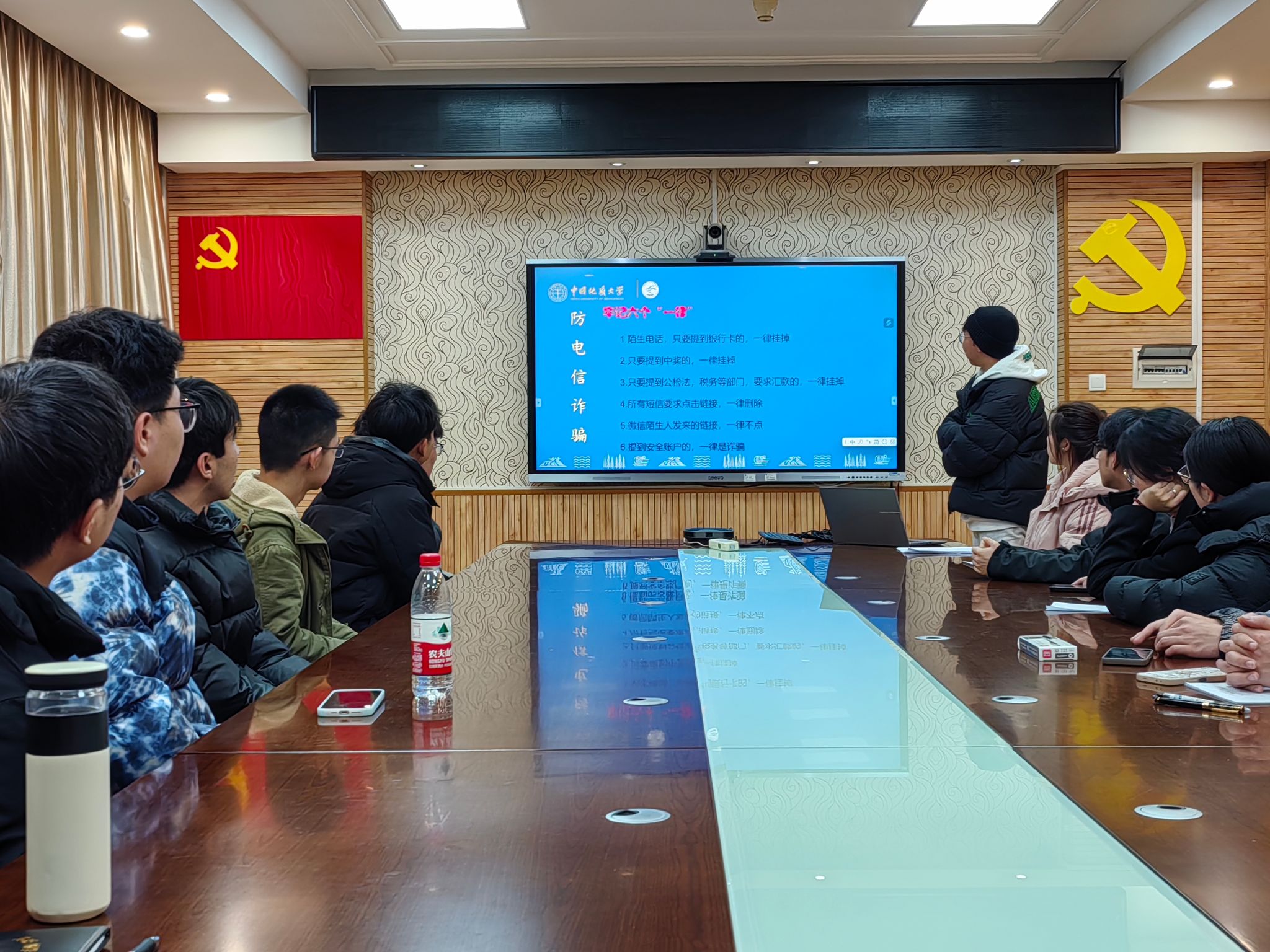 班级安全与生活委员通过主题分享、互动课堂等形式在班级进行校园安全教育宣讲,内容包括交通安全、消防安全、人身安全、财产安全等方面,借助身边的案例重点提醒防骗反诈和防火安全,提醒班级同学做好宿舍安全自查,增强校园安全基本常识,熟悉常用消防设施使用方法。
