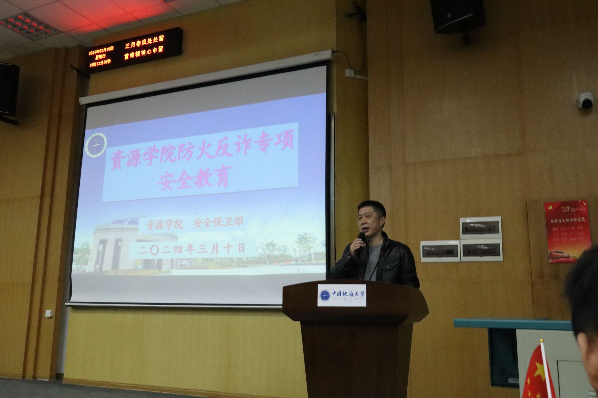 安全保卫部彭红进、魏景明两位老师分别从消防安全教育和防电信网络诈骗教育进行介绍。