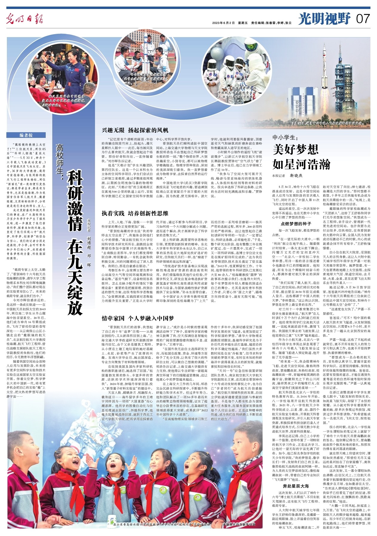 此次发射盛况和航天员们的事迹,在广大高校师生乃至少年学子中产生了强烈反响,进一步激发了他们崇尚科学、探索未知的兴趣,也坚定了他们实现心中“航天梦、科学梦、创新梦”的信念与信心。我们的记者分别走进高校、中小学,去听听青年和少年们的心声,共同感受青春梦想的力量、科技报国的激情。