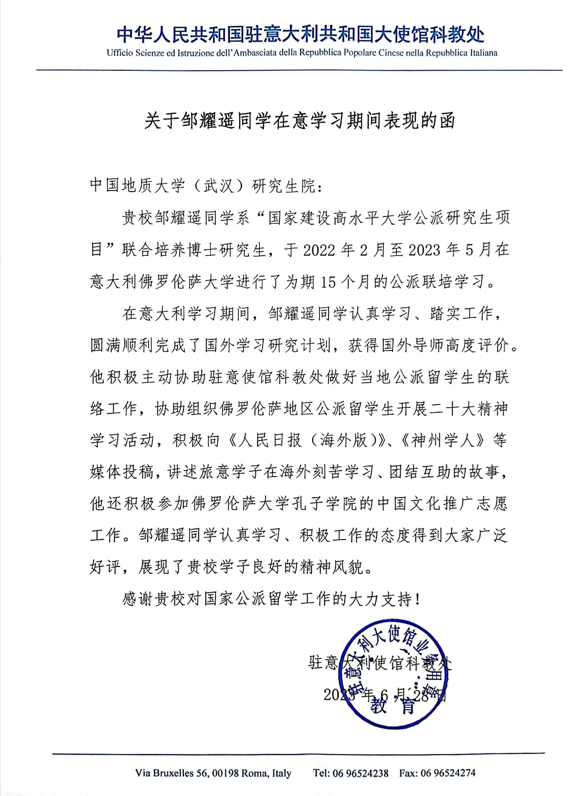 第十三次党代会代表、校博士生讲师团成员。在沈传波教授的指导下,他主要开展含油气裂谷盆地的三维构造分析、构造热年代学及构造物理模拟实验研究,曾获研究生国家奖学金、校级优秀研究生标兵、校优秀学生党员等荣誉称号。2022年2月,获国家留学基金资助前往意大利佛罗伦萨大学进行博士联合培养,期间积极向《人民日报(海外版)》《神州学人》投稿,讲述旅意学子在科技合作与文化交流中的奋斗故事,获评全意学联“旅意学子优秀志愿者”,获我国驻意大利大使馆科教处致函表扬。